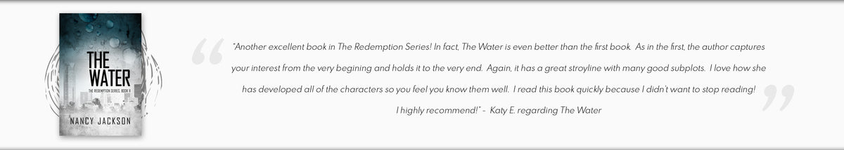 I really enjoy series fiction, and Nancy Jackson is a master at keeping the series new and exciting yet developing each character, maintaining their specific personalities and the connecting segments of each one's story thus bringing everyone and every situation together so expertly.. Wow! I love these wonderful characters with each having areas in their lives that need surrender either to love, or from fear, from addiction, or surrender to faith all mingled with a suspenseful storyline and situations that keep you turning pages waiting, reading and anxious for resolutions.. The Water is a wonderful second installment in this marvelous series! Hang onto your hat! Carrie, Randy, Sandy & Beth find themselves in situations you will stay on the edge of your seat to find how it turns out.. The mystery continues.....