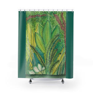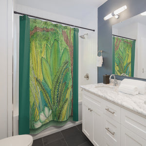This is an exclusive Nancy Jackson original art design of deep in the jungle. It's vivid cool blue greens and textured foliage will set any bathroom apart.