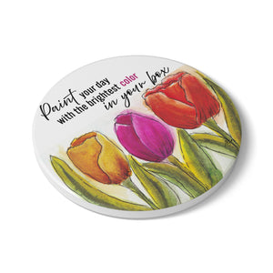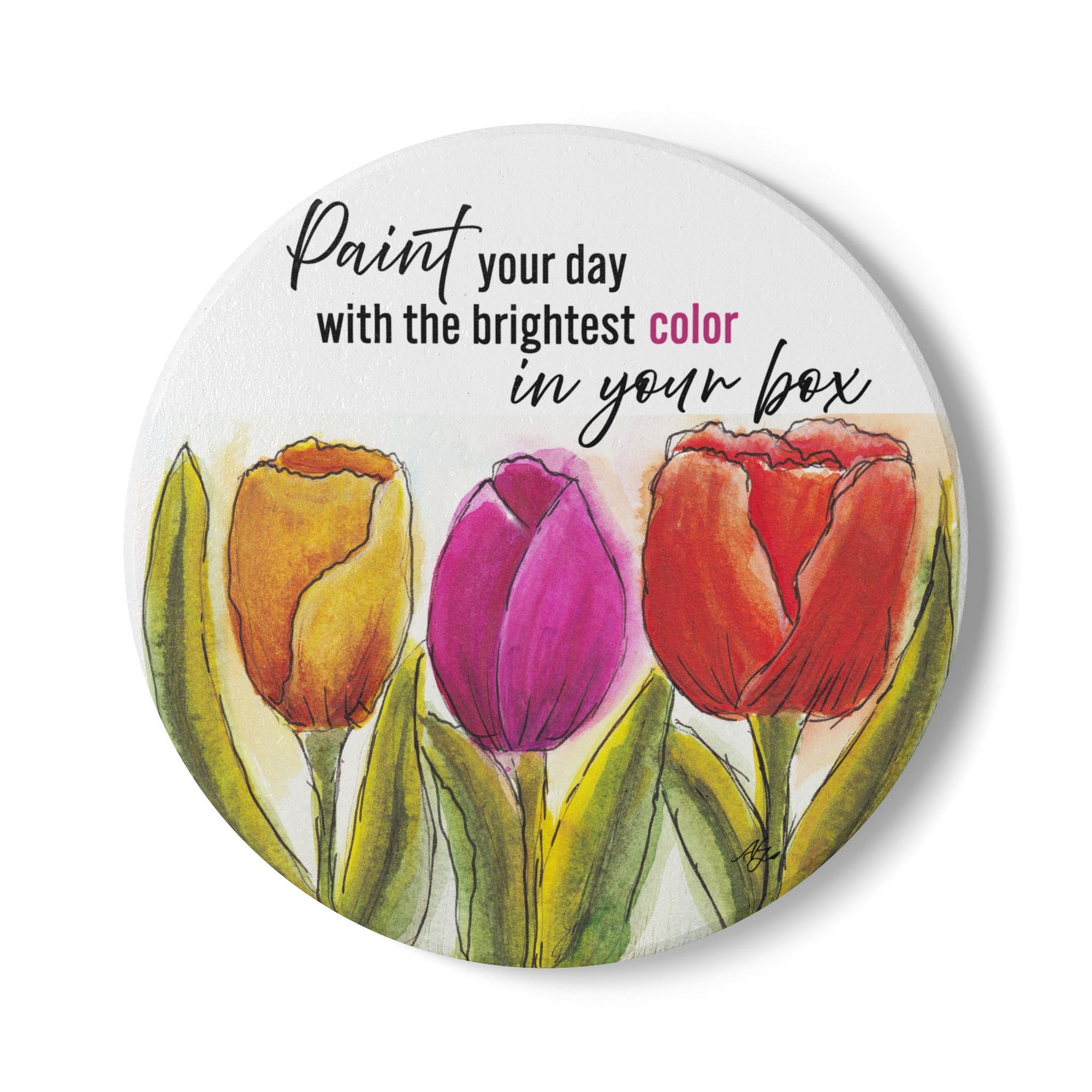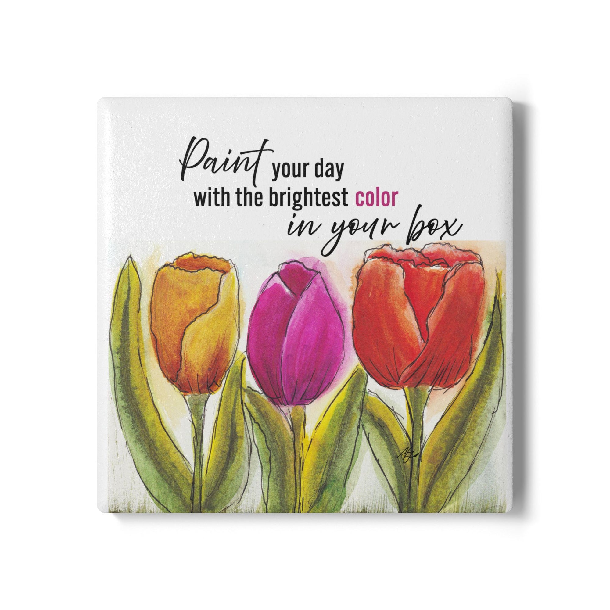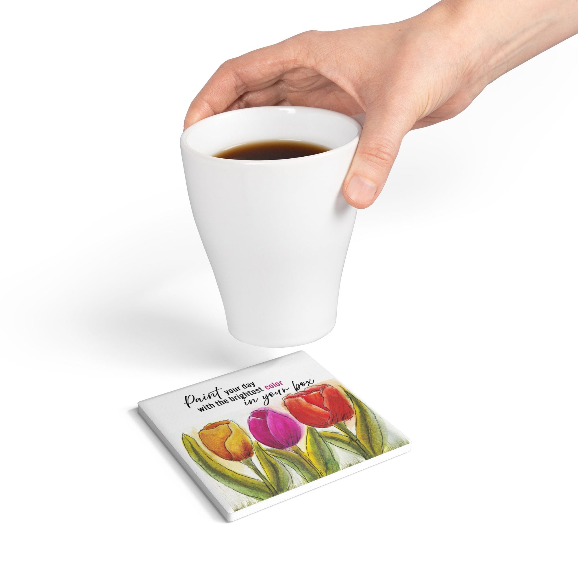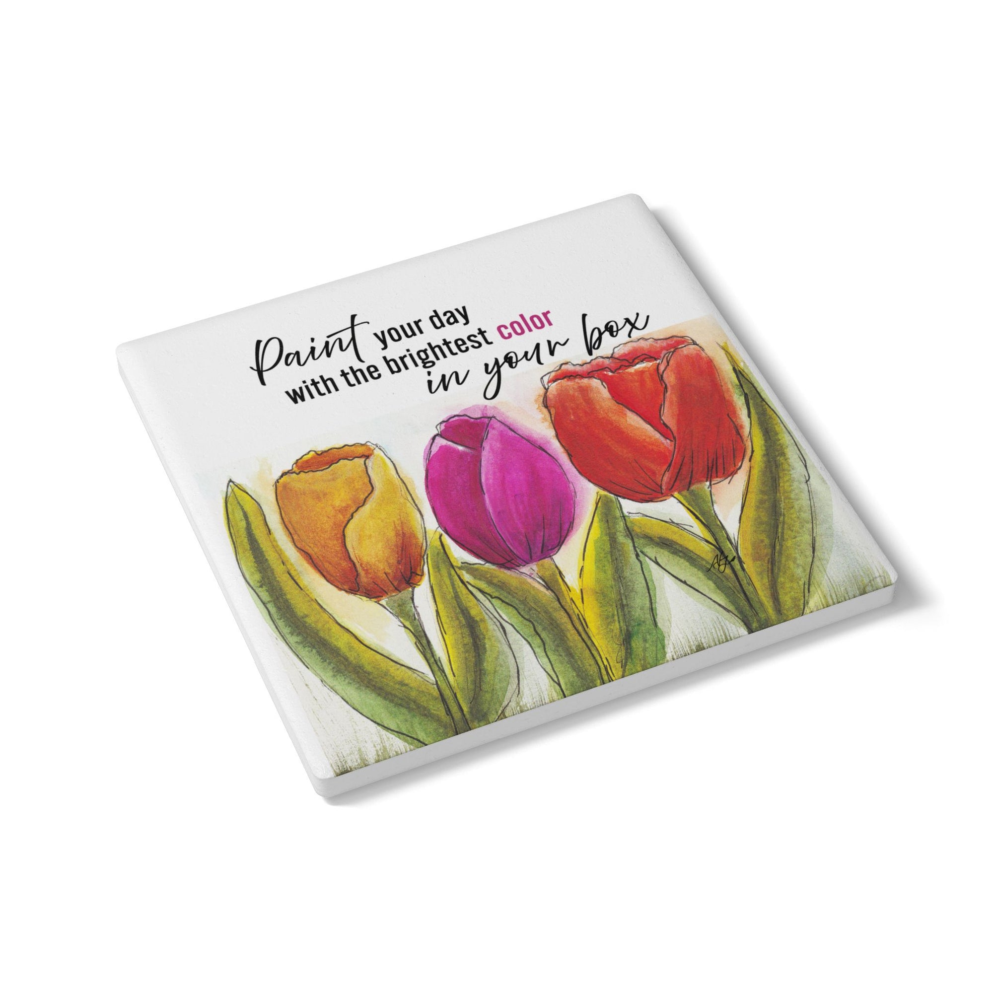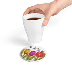 Designer Ceramic Coaster with a Trio of Tulips and Quote