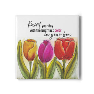 This is an exclusive Nancy Jackson original art design with a bold trio of tulips in magenta, yellow, and orange and an encouraging quote.