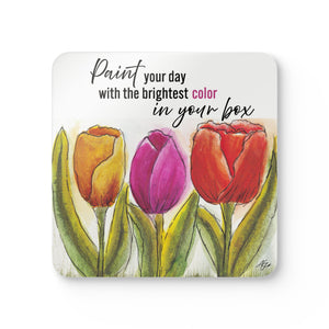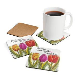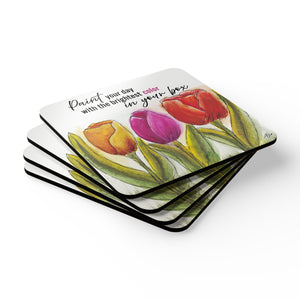 Designer Cork Coaster Set with a Trio of Tulips and Quote