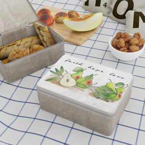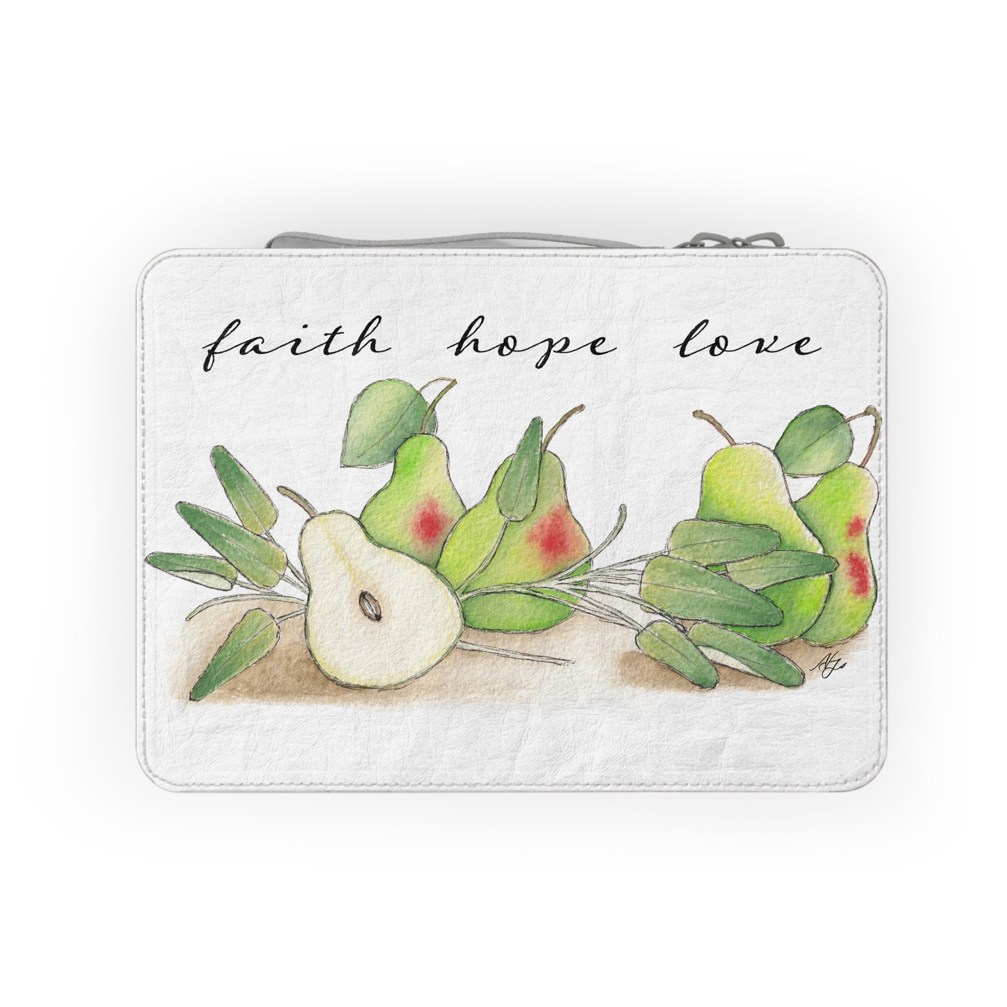 This is an exclusive Nancy Jackson original art design with pears and sage and the words - faith, hope and love.