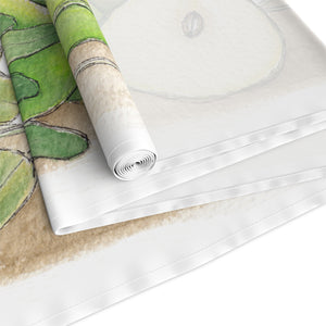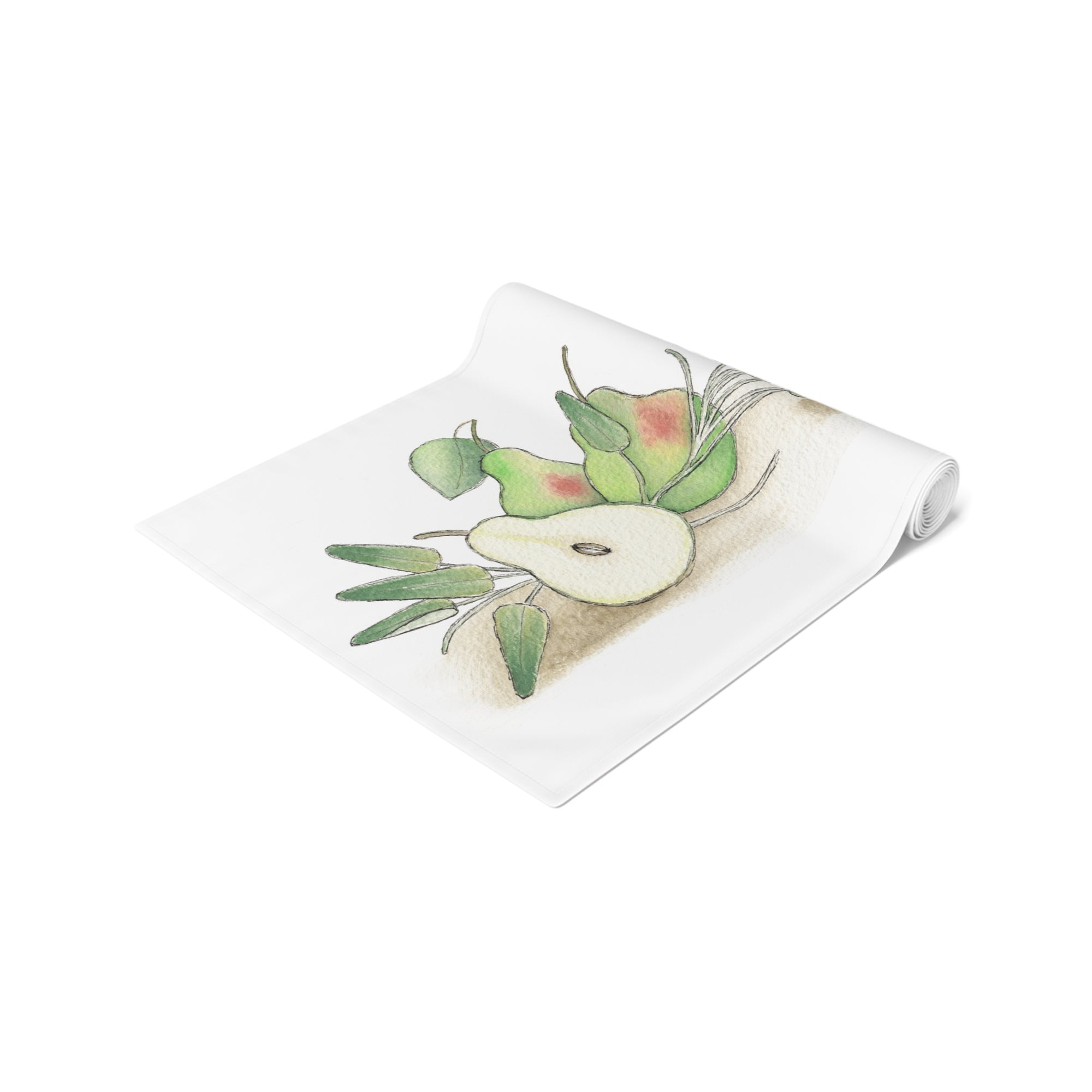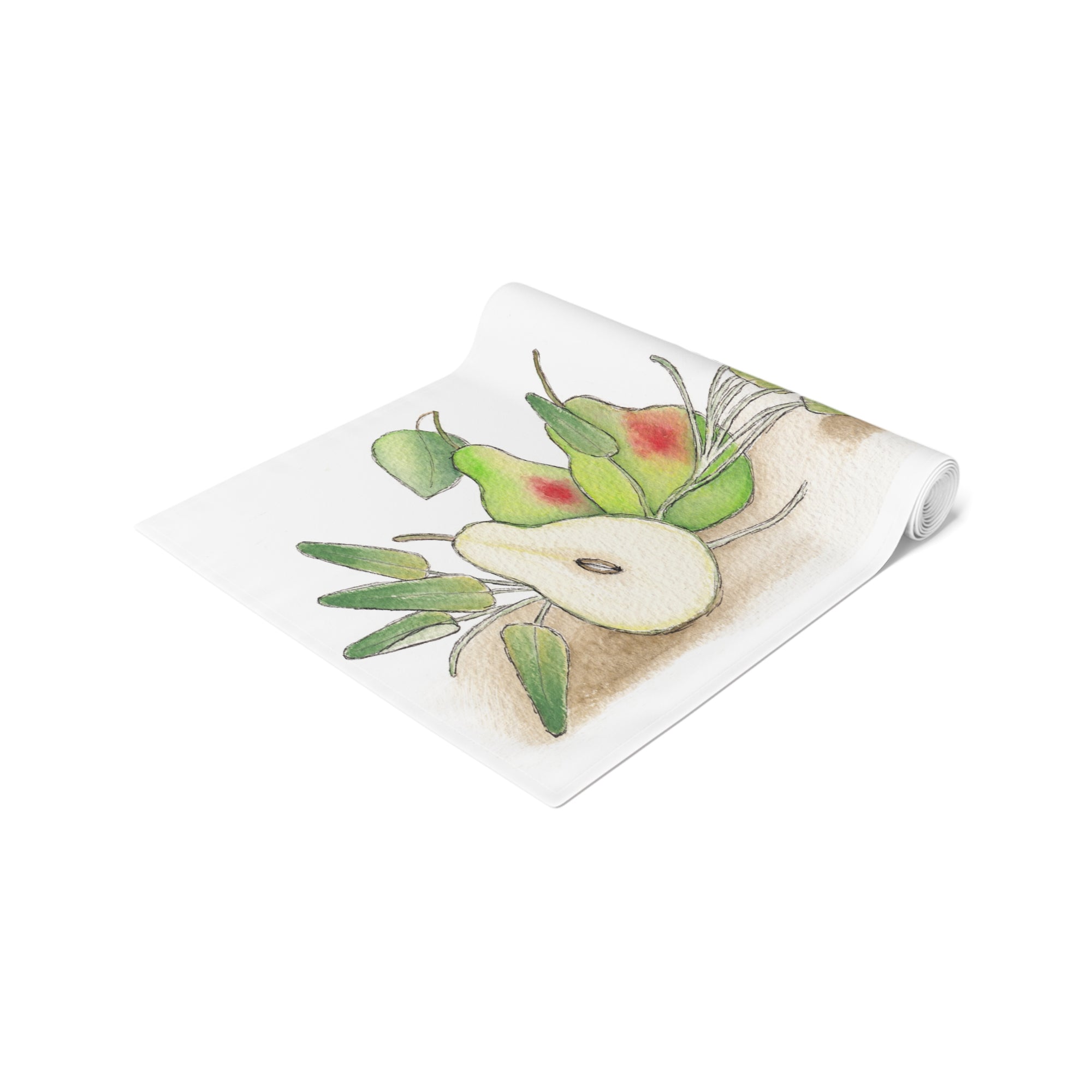 This is an exclusive Nancy Jackson original art design of pears and sage. Comes in multiple sizes to fit most any table size. Your table will be unique and engaging.