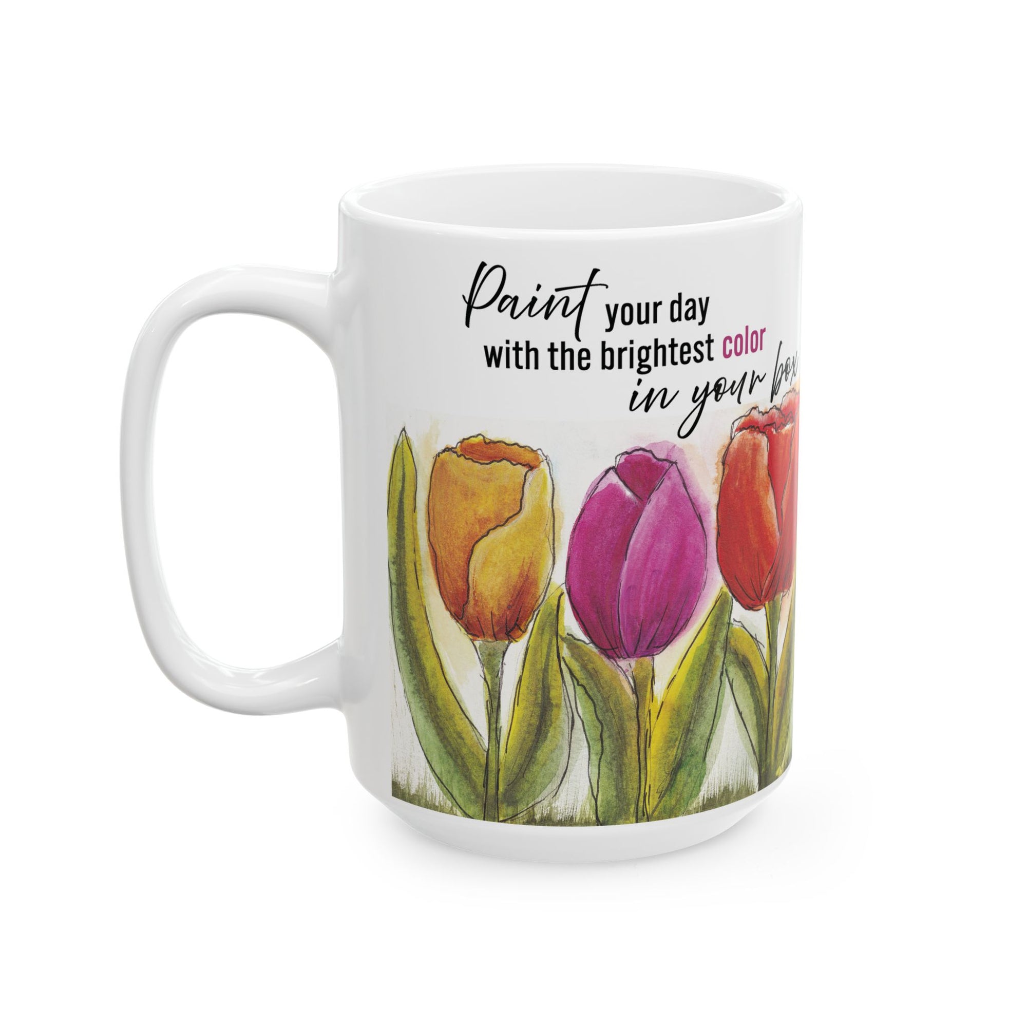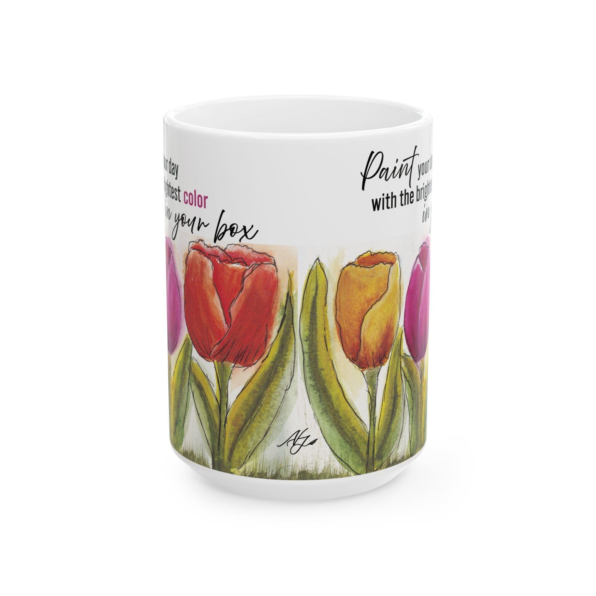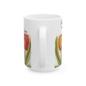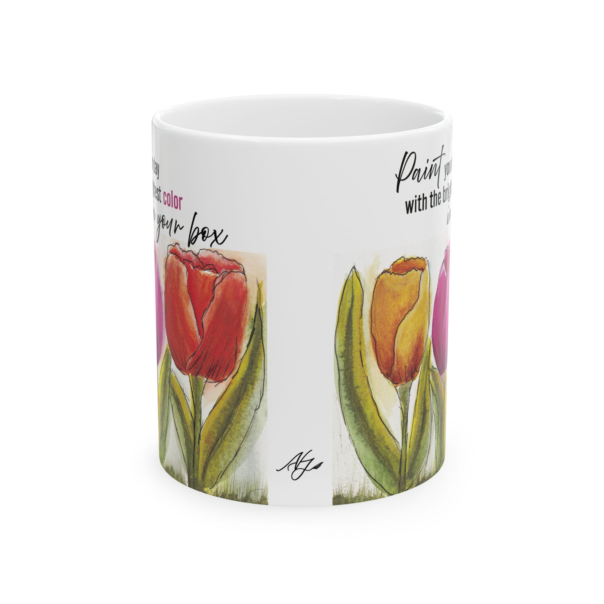Designer Floral Ceramic Mug with a Trio of Tulips